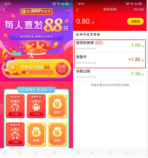 新浪微博每天抽随机免费现金红包,可提现至支付宝 2020年8月12日 / 活动线报 新浪微博发发节的活动,即日起至28号,每天都可以参与。抽中的免费现金红包是可以直接提现至支付宝的,但是有金额限制。 活动详情: 一、用新浪微博app扫描下方二维码跳转到新浪新闻,使用微博账号登陆新浪新闻,然后翻下面6个红包即可。基本上都会有一个现金红包,中奖后下拉,然后去提现到微博钱包,非秒到,然后微博钱包提现至支付宝即可。 二、另外还可以坚持签到10天必得8.8元免费现金红包。